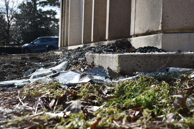 Yellow police tape on Monday blocked off the entrances to the synagogue building, which was surrounded by broken glass and soot. Bouquets of flowers were laid on the ground at the building's entrance — including one with a note that said, “I'm so very sorry.”