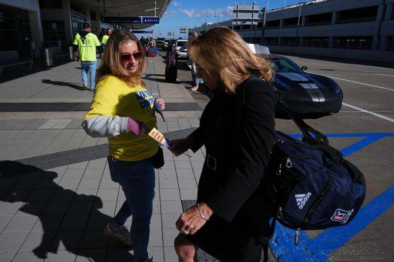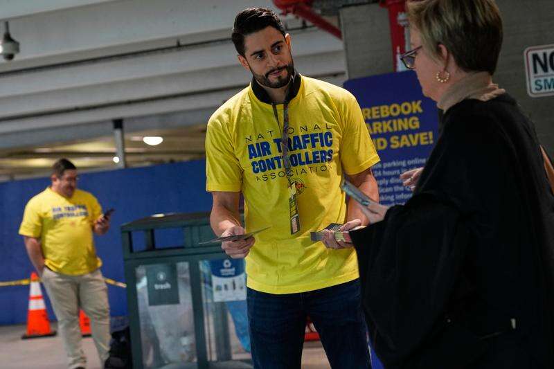 Air Traffic Controller Claudia Peterfeso distributes leaflets explaining how the federal government shutdown is impacting air travel at Detroit Metropolitan Wayne County Airport Tuesday, Oct. 28, 2025, in Romulus, Mich. (AP Photo/Paul Sancya)