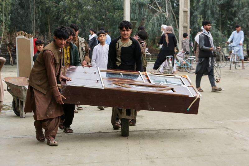 Residents carry furniture in a wheelbarrow as they clear an area damaged by heavy flooding in Jalalabad, Afghanistan, Saturday, April 4, 2026. (AP Photo/Wahidullah Kakar)