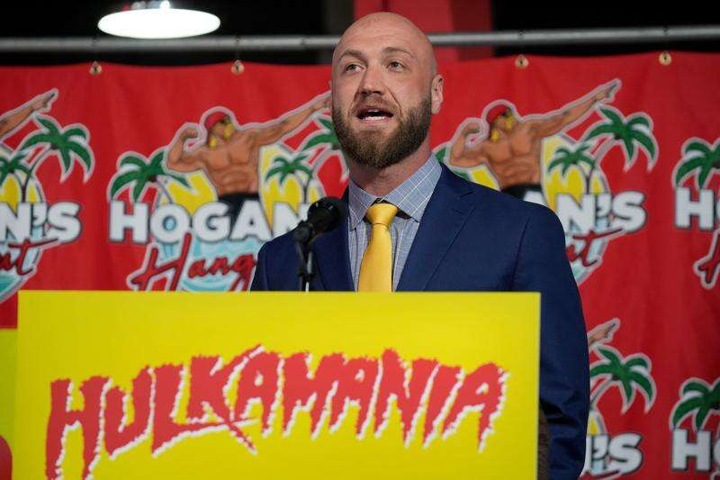 Nick Hogan, son of wrestling legend Hulk Hogan, speaks after Florida Gov. Ron DeSantis named a trail in honor of Hulk Hogan during a news conference Friday, Oct. 3, 2025, in Clearwater, Fla. (AP Photo/Chris O'Meara)