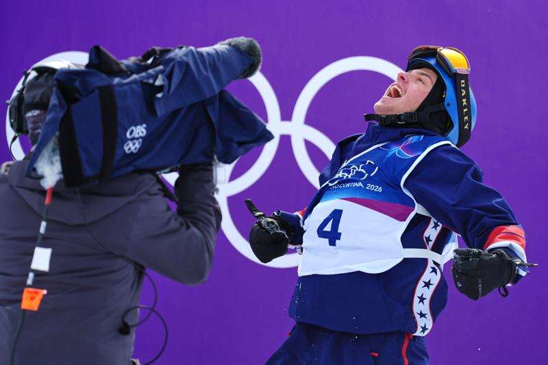 United States' Jake Canter celebrates during the men's snowboarding slopestyle finals at the 2026 Winter Olympics, in Livigno, Italy, Wednesday, Feb. 18, 2026. (AP Photo/Rebecca Blackwell)