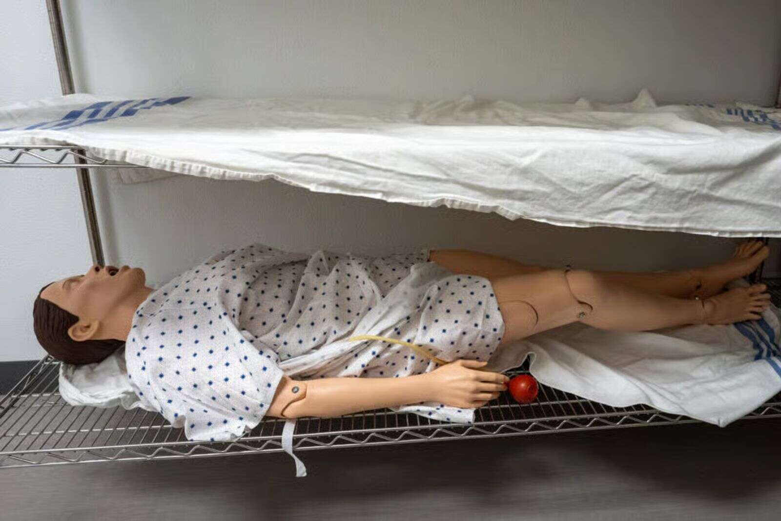 A mannequin dressed in a hospital gown lay on a bed, wearing a wig with narrow red lips painted on. When prompted from a computer by an instructor, she began to moan and make other sounds of distress the nursing students were learning to respond to. Nursing instructors can make things more complicated by making changes to the mannequin’s vital signs or using a mannequin representing a different age to see how students adjust their efforts to care for patients depending on their specific needs.