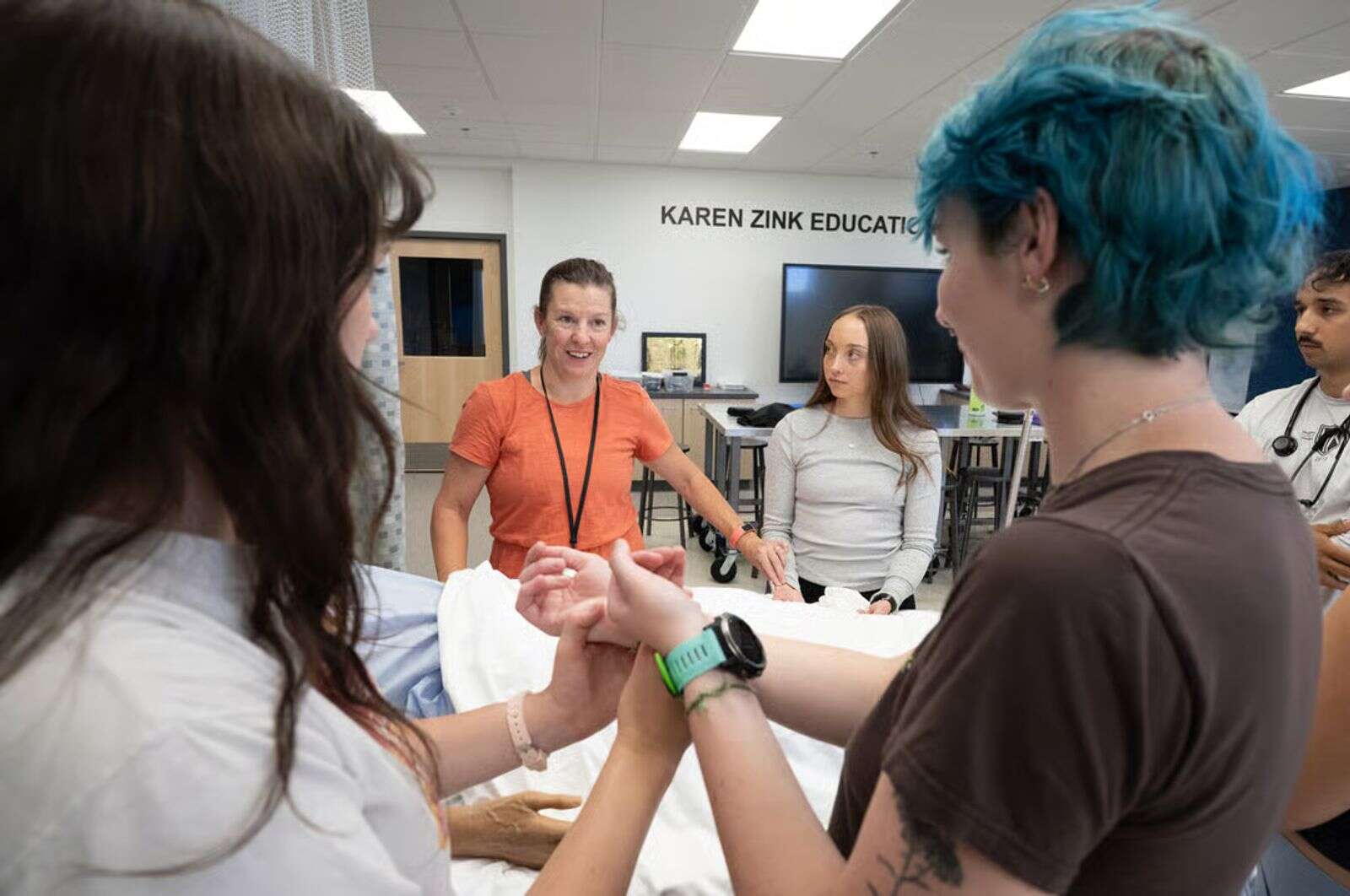Dr. Linden Lane, center, instructs Fort Lewis College nursing students on how to check for a pulse from each other, while standing over a mannequin that can be programmed to simulate feelings and pain on Sept. 15. (Hart Van Denburg/CPR News)