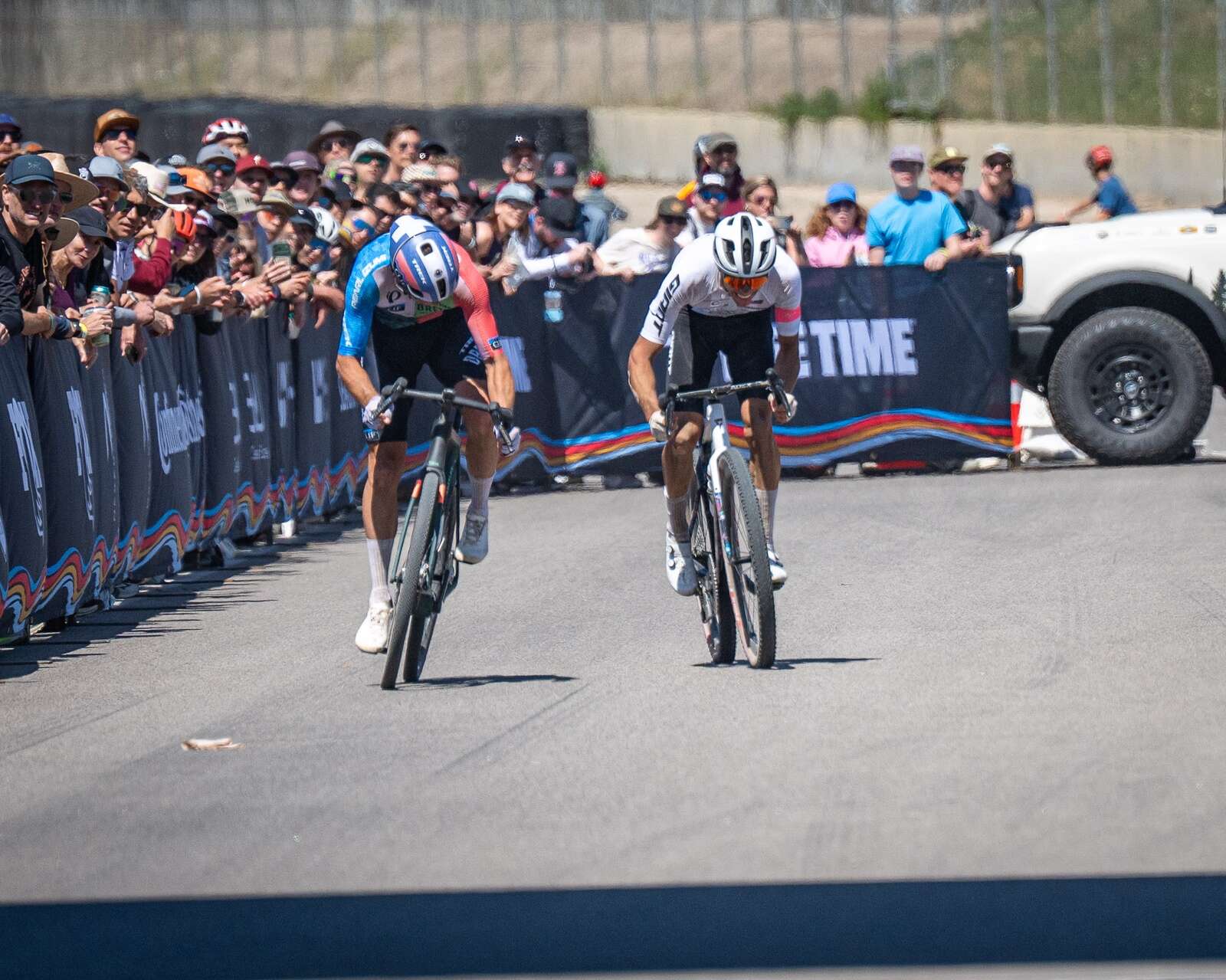 The start of the Sea Otter men’s race was pretty hectic with 137 riders climbing up part of the WeatherTech Raceway Laguna Seca before getting into the off-road part of the course. Freeburn didn’t have the best start, struggling to clip into his pedals. He almost ran into the slow-moving media car after that, but he didn’t panic, despite being stuck behind some people in the first downhill. He caught up to the leaders on the first main climb.