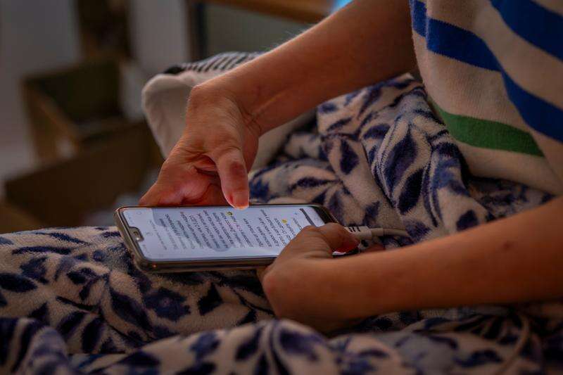 Olena Janchuk, 53, chats online on her phone charged from a power bank during prolonged power outages following Russian attacks on energy objects in Kyiv, Ukraine, Tuesday, Jan. 20, 2026. (AP Photo/Dan Bashakov)
