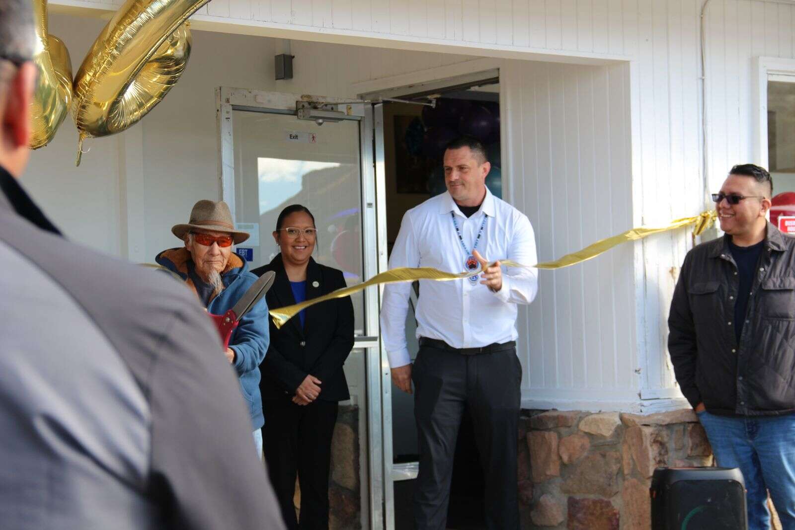 Ute Mountain Ute elder Floyd Morris cuts the ribbon at Nuchu Market’s grand opening Jan. 5. Ute Mountain Ute Councilwoman Marilynn House (second right), Nuchu Market general manager Chad Pearce (third right) and Councilman Alston Turtle looked on after each speaking about efforts to complete the grocery store. (Anna Watson/The Journal)