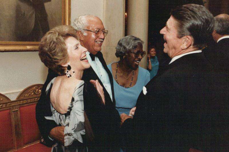 In this photo provided by The White House, John Woodson Ficklin and his wife Nancy talk with President Ronald Reagan and first lady Nancy Reagan as they attend as guests at a State Dinner at the White House on July 19, 1983, in Washington. (The White House via AP)