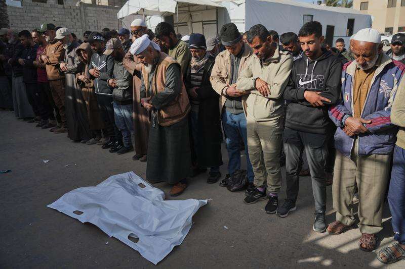 Mourners pray beside the body of Iyad Abu Rabi, 3, who was killed when an Israeli strike hit tents sheltering displaced people along the coast of Khan Younis, according to hospital officials, at Nasser Hospital in Khan Younis, Gaza Strip, Monday, Feb. 2, 2026. (AP Photo/Jehad Alshrafi)