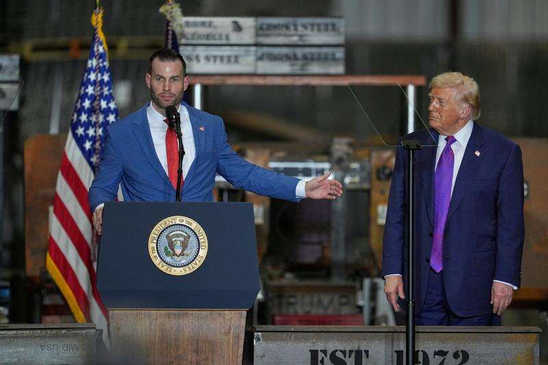 Congressional candidate Clay Fuller speaks as President Donald Trump listens at a rally at Coosa Steel Corporation in Rome, Ga., Thursday, Feb. 19, 2026. (AP Photo/George Walker IV)