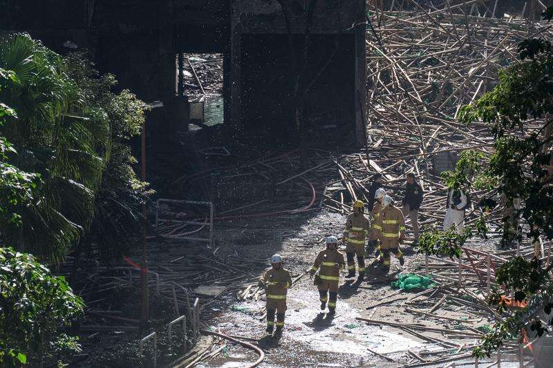 Firefighters walk through the burned buildings after the deadly fire that started Wednesday at Wang Fuk Court, a residential estate in the Tai Po district of Hong Kong's New Territories, Saturday Nov. 29, 2025. (AP Photo/Chan Long Hei)