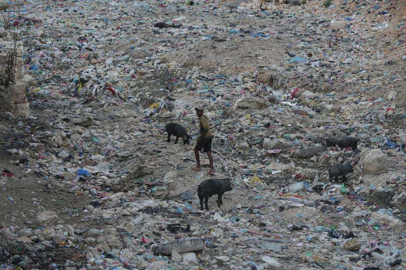 A man walks through a garbage filled ravine where pigs search for food in the Petion-Ville neighborhood of Port-au-Prince, Haiti, Wednesday, March 25, 2026. (AP Photo/Odelyn Joseph)