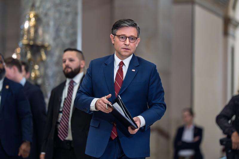 Speaker of the House Mike Johnson, R-La., walks from the chamber to speak with reporters after the final vote to bring the longest government shutdown in history to an end, at the Capitol in Washington, Wednesday, Nov. 12, 2025. (AP Photo/J. Scott Applewhite)