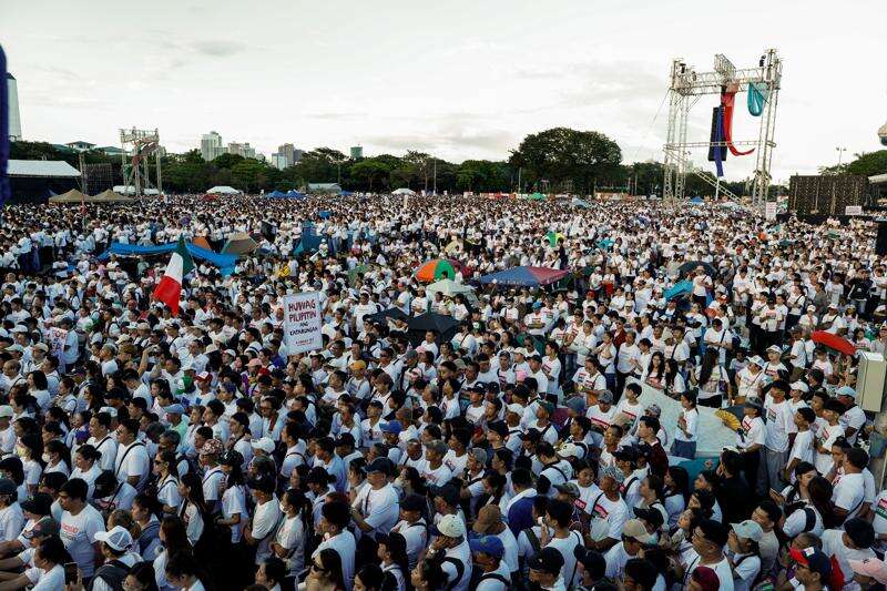 About 650,000 members of the Iglesia Ni Cristo, or Church of Christ, joined the start of the three-day rally Sunday in Manila’s Rizal Park despite intermittent rains, police said. Many wore white shirts and carried anti-corruption placards. About 2,000 people, including retired generals, held a separate anti-corruption protest late Sunday at the “People Power” monument in suburban Quezon city.