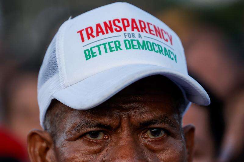 Members of the religious sect Iglesia Ni Cristo (Church of Christ) are reflected on a puddle of water as they participate in a three-day anti-corruption rally at Manila's Rizal Park, Philippines, Sunday, Nov. 16, 2025. (AP Photo/Mark Cristino)