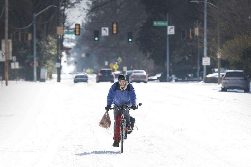 Jean Christophe rides his bike home from Kroger on snow and ice in Memphis, Tenn., Wednesday, Jan. 28, 2026. (Mark Weber/Daily Memphian via AP)