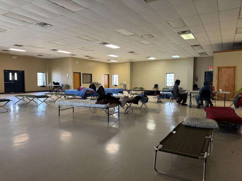 Sherry Miller, who is staying at the Humphreys County warming center, passes the time playing dominoes with others seeking shelter in Belzoni, Miss., on Thursday, Jan. 29, 2026. (AP Photo/Sophie Bates)