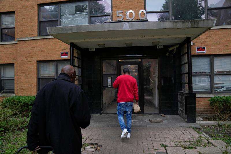 People enter the building on Oct. 10, 2025, at 7500 South Shore Drive in Chicago, which was raided by federal agents on Sept. 30. (AP Photo/Erin Hooley)