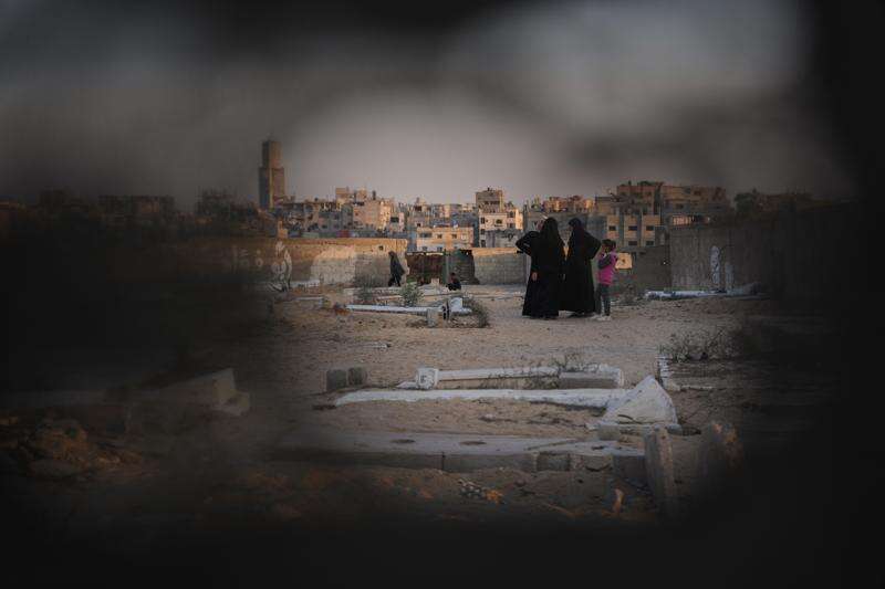 Here and in other cemeteries in Gaza, there is life among the dead. A prayer rug hangs on a line. A child pushes a water jug on a wheelchair between the graves. Smoke rises from a cooking fire.