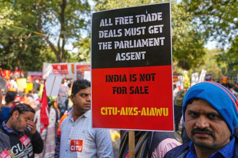 NEW DELHI (AP) — A coalition of major trade unions and farmers’ groups in India mounted a nationwide strike Thursday to protest an interim trade deal with the United States, saying the agreement undermines the interests of farmers, small businesses and workers.