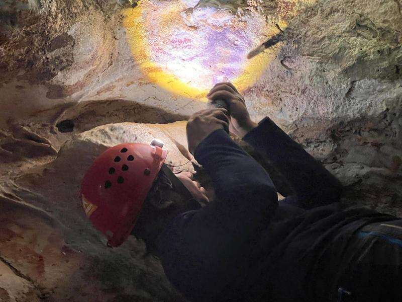 This image provided by Maxime Aubert shows scientist Shinatria Adhityatama studying cave art found in Sulawesi, Indonesia. (Maxime Aubert via AP)