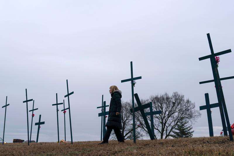 FILE - Crosses are seen at a makeshift memorial for the victims of the plane crash in the Potomac River near Ronald Reagan Washington National Airport, Jan. 31, 2025, in Arlington, Va. (AP Photo/Jose Luis Magana, File)