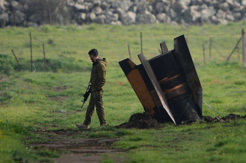 FILE - An Israeli soldier stands next to a fragment of a missile fired from Iran and intercepted by Israeli air defense system embedded in an open field in the Israeli-controlled Golan Heights, March 19, 2026. (AP Photo/Ohad Zwigenberg, File)