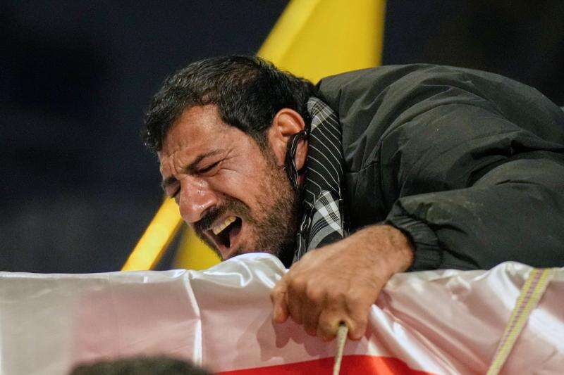 Relatives grieve in Baghdad, Iraq, on Thursday, March 12, 2026, during a funeral for members of the Popular Mobilization Forces who were killed in a U.S. airstrike in Qaim. (AP Photo/Hadi Mizban)