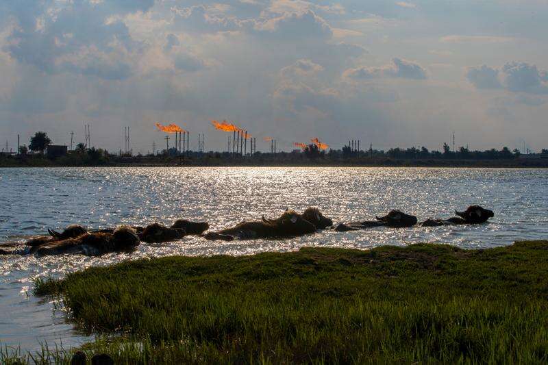 FILE - Water buffaloes swim near the Nihran Bin Omar oil field north of Basra, Iraq, Wednesday, March 22, 2023. foreign investment in Iraq's history. (AP Photo/Nabil al-Jurani, File)