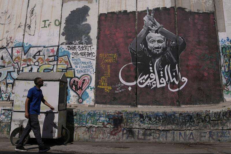 FILE - A man walks past a mural depicting the Palestinian leader Marwan Barghouti, with a message that reads in Arabic, "See you soon,� on Israel's separation barrier in the West Bank city of Bethlehem, Aug. 20, 2025. (AP Photo/Mahmoud Illean, File)