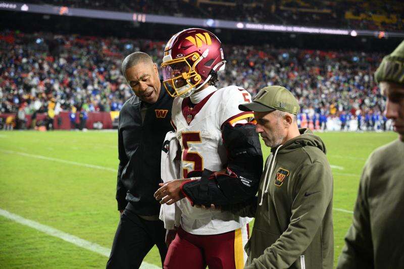 Washington Commanders quarterback Jayden Daniels (5) is helped off the field after he injuring his arm during a play in the second half of an NFL football game, Sunday, Nov. 2, 2025, in Landover, Md. (AP Photo/Nick Wass)