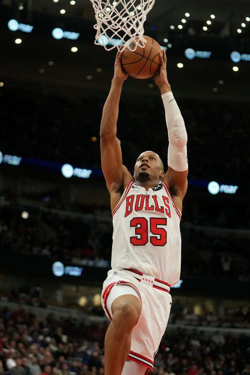 Chicago Bulls forward Isaac Okoro (35) drunks the ball during the first half of an NBA basketball game against the Denver Nuggets, Saturday, Feb. 7, 2026, in Chicago. (AP Photo/Erin Hooley)