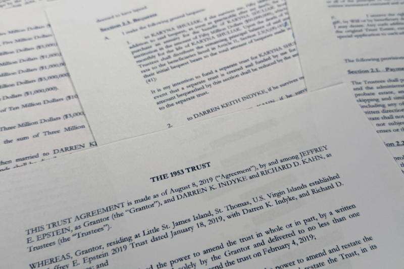 A document that was included in the U.S. Department of Justice release of the Jeffrey Epstein files, photographed Thursday, Feb. 5, 2026, shows the 1953 Trust that Epstein amended on Aug. 8, 2019. (AP Photo/Jon Elswick)
