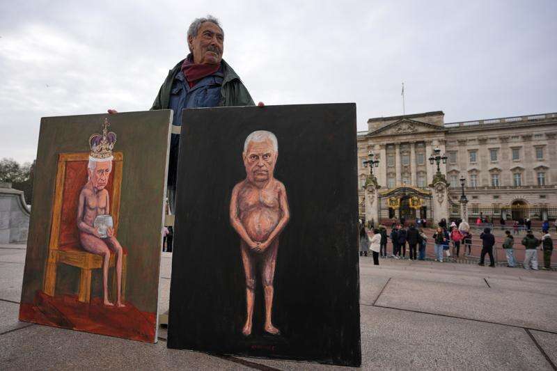 Artist Kaya Mar sposes with the newest edition of his paintings for the media in front of Buckingham Palace, London, Friday, Feb. 20, 2026 after Andrew Mountbatten-Windsor was arrested and held for hours by British police on suspicion of misconduct in public office related to his links to Jeffrey Epstein.(AP Photo/Kin Cheung)