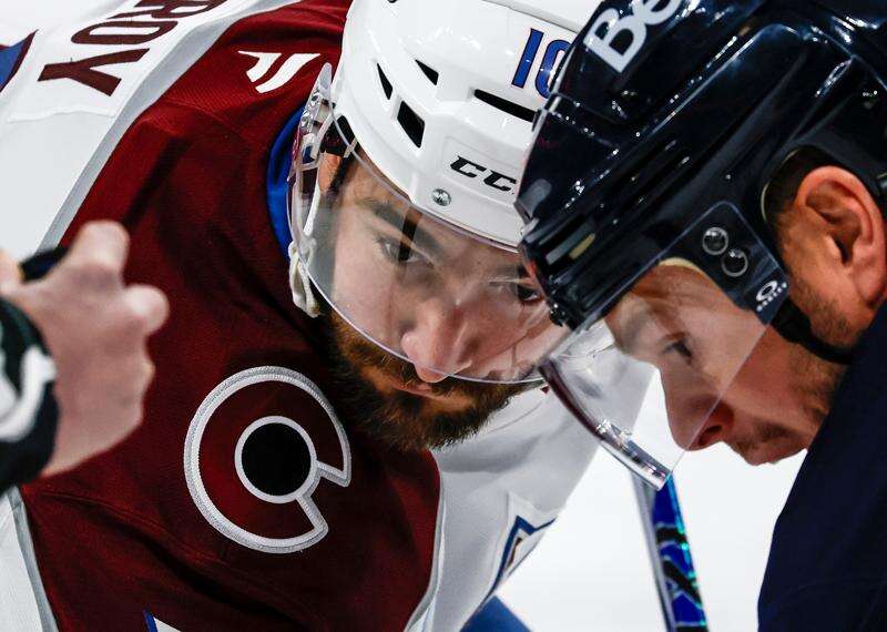 Winnipeg Jets' Jonathan Toews (19) and Colorado Avalanche's Nicolas Roy (10) face-off during the first period of an NHL game in Winnipeg, Manitoba, Saturday, March 14, 2026. (John Woods/The Canadian Press via AP)