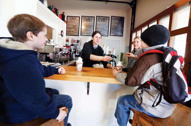 Fahrenheit Coffee Roasters owner, Linda James, hands chocolate steamers to brothers Jake, 8, left, and Colby Lewis, 6, on Monday as mom, Victoria Lewis enjoys her coffee. The coffee shop in located on Grand Avenue in a historic building that was once a gas station. JERRY McBRIDE/Durango Herald
