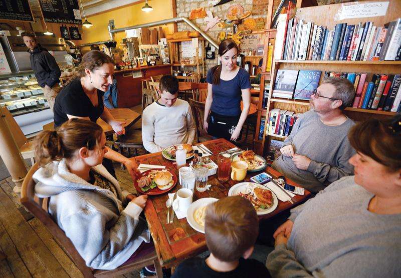 Absolute Bakery servers Heather Klein, left, and Autumn Robbins, deliver lunch to from left, Emma Diffey,15, Ethan Diffey, 17, Scott Lyman, Shannon Lyman and Harley Lyman, 9, on Monday. JERRY McBRIDE/Durango Herald