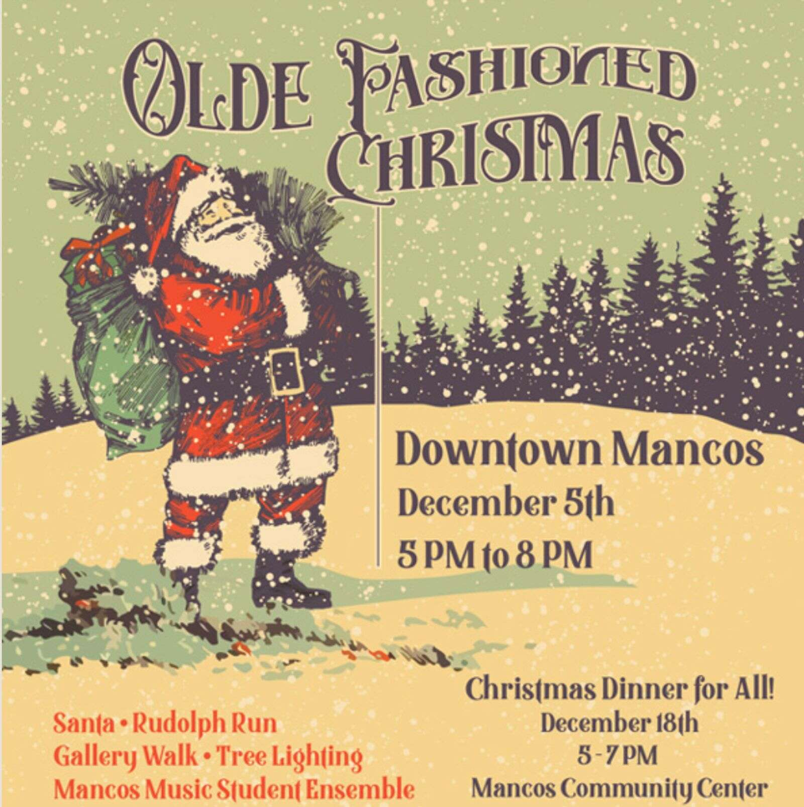 Mancos’ annual Olde Fashioned Christmas celebration will be Friday, Dec. 5, in downtown Mancos, with family-friendly events from 5 to 8 p.m., including the lighting of the community Christmas tree in Pioneer Plaza.