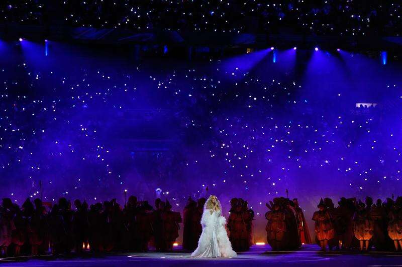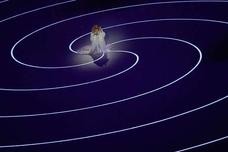 Singer Mariah Carey performs during the Olympic opening ceremony at the 2026 Winter Olympics, in Milan, Italy, Friday, Feb. 6, 2026. (AP Photo/Ashley Landis)