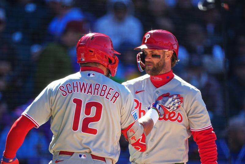 The Phillies set the tone early by sending 11 batters to the plate against Michael Lorenzen (0-1) to begin the game. They finished with 13 hits, including three homers — all by lefties — with the wind blowing from left field. Marsh hit a sinker that went a projected 454 feet to the second deck in right-center. In the second, Bryce Harper launched a solo shot. Kyle Schwarber added a 460-foot drive to right field in the fifth.