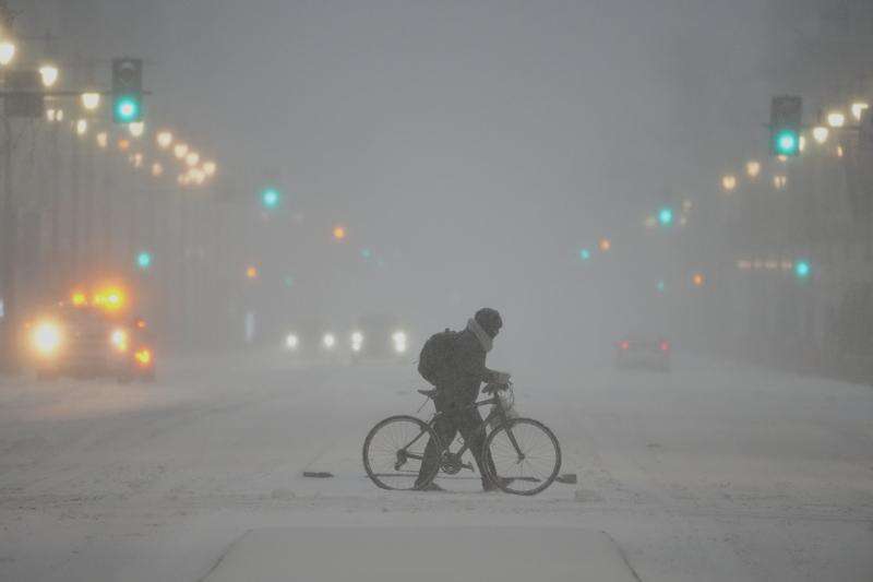 A person pushed a bicycle during a winter storm in Philadelphia, Sunday, Jan. 25, 2026. (AP Photo/Matt Rourke)