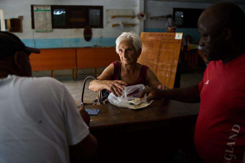A woman receives a donation from Mexico at a state-run bodega during a blackout in Havana, Wednesday, March 4, 2026. (AP Photo/Ramon Espinosa)