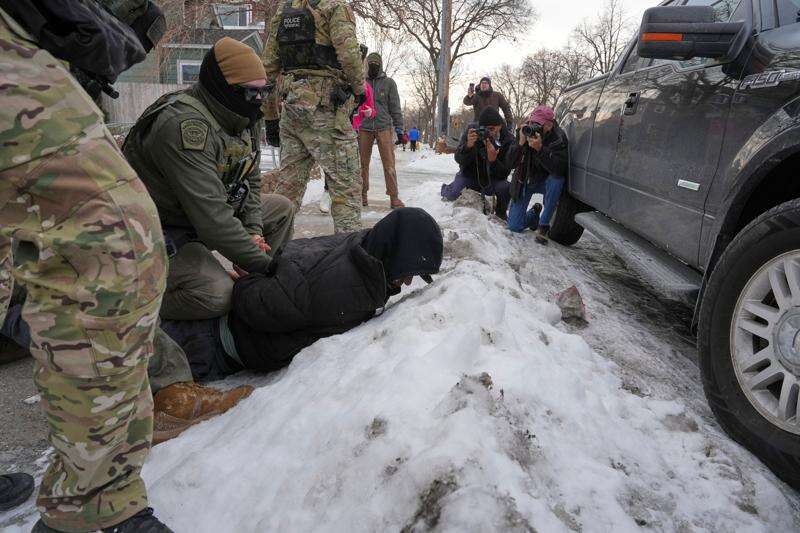 Federal agents look on after detaining a person during a patrol in Minneapolis, Minn., Sunday, Jan. 11, 2026. (Christopher Katsarov/The Canadian Press via AP)