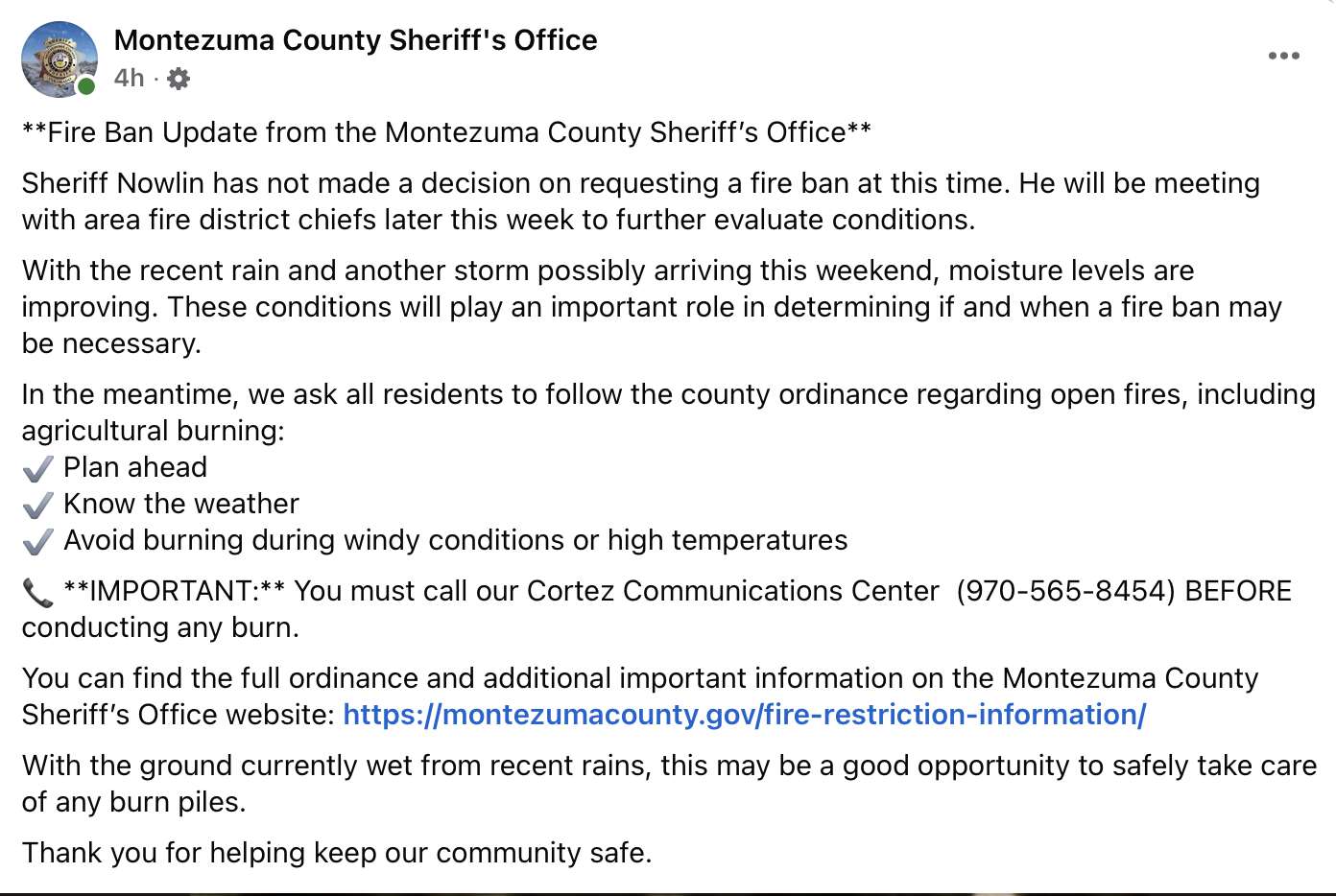As Montezuma County residents await a final decision on a fire ban, wet conditions this week may provide a safer window for pile burning, according to the Montezuma County Sheriff’s Office.