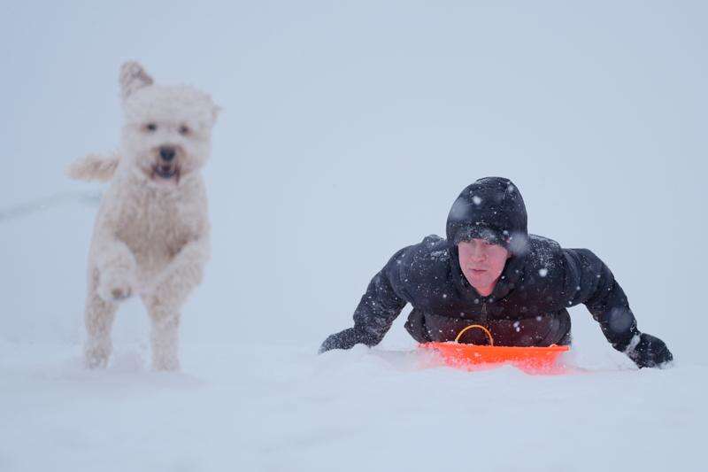 Alex Taylor, 23, and his dog Daisy, make their way down a snowy hill in Charlotte, N.C., Saturday, Jan. 31, 2026. (AP Photo/Erik Verduzco)