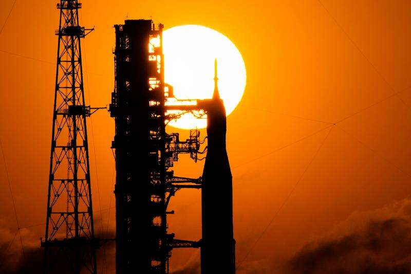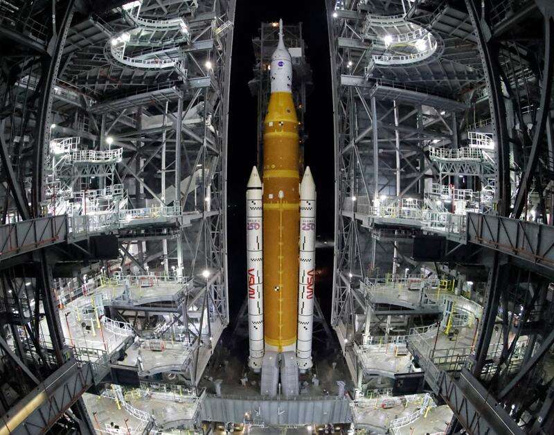 NASA’s new Space Launch System rocket stands 322 feet (98 meters), shorter than the Apollo program’s Saturn V rocket but more powerful at liftoff thanks to a pair of strap-on boosters. Atop the rocket is the Orion capsule carrying the astronauts.