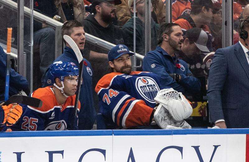 Edmonton Oilers goalie Stuart Skinner (74) sits on the bench after being pulled against the Colorado Avalanche during second period of an NHL game, in Edmonton on Saturday, Nov. 8, 2025. (Jason Franson/The Canadian Press via AP)