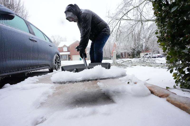 David Bentley shovels ice and snow from his driveway during a winter storm Sunday, Jan. 25, 2026, in Nashville, Tenn. (AP Photo/George Walker IV)
