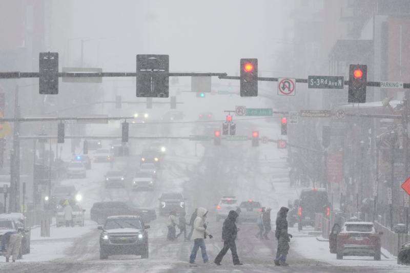 Pedestrians cross the street along Broadway during a winter storm Saturday, Jan. 24, 2026, in Nashville, Tenn. (AP Photo/George Walker IV)