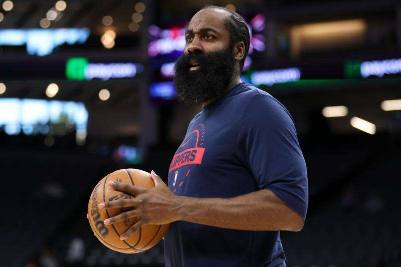 Los Angeles Clippers guard James Harden looks on before an NBA basketball preseason game against the Sacramento Kings, Wednesday, Oct. 15, 2025, in Sacramento, Calif. (AP Photo/Scott Marshall)