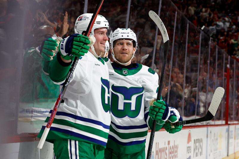 The teams sported throwback uniforms from their previous homes, with the Avalanche wearing Quebec Nordiques jerseys while the Hurricanes were decked out in Hartford Whalers garb.